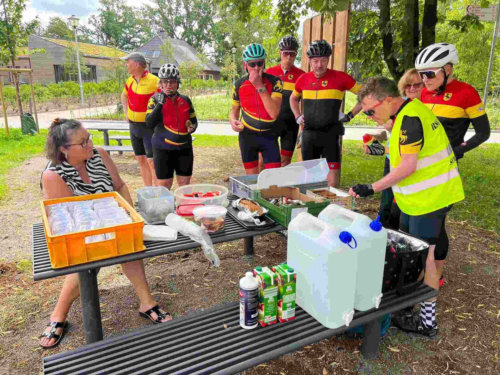 Freitag um 10 Uhr war Treffpunkt am Gysenberg. 120 km für die Anreise mit zwei kleinen Bergwertungen waren für alle Mitfahrer gut zu schaffen. Das letzte Gepäck wurde verteilt, ein Foto geschossen und dann gings los in Richtung Becklem, um dort unseren Schriftführer abzuholen. Ab da gings dann in geschlossener Gruppe weiter. Wie in 2021 hatten wir Haltepunkte an der Füchtener Mühle, in Darup und in Steinfurt vereinbart, wo uns die Begleitwagen versorgten. „Versorgten“: die Wortwahl ist maßlos untertrieben. Die Begleitdamen hatten ein Buffet vorbereitet. Es gab Blätterteigröllchen (mit Lachs, Pesto, Käse und Schinken), Kirsch- und Blaubeermuffins, Bananenbrot, Kirschstreusel, Studentenfutter, Salzbrezel und viele andere Dinge. Wasser mit und ohne Konzentrat, Apfelschorle und Cola waren als Durstlöscher im Angebot.